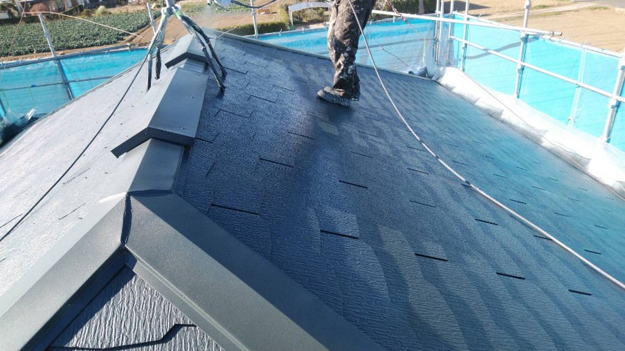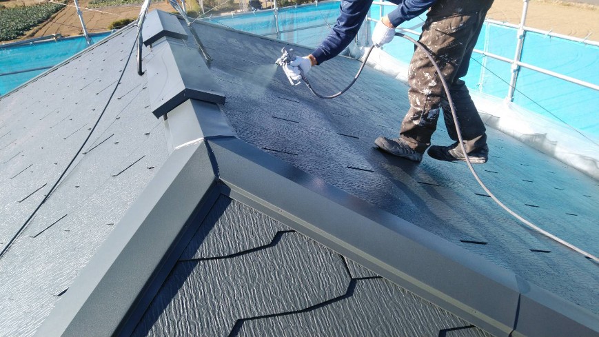 深谷市 個人様邸 屋根塗装 エアレスで吹いてます